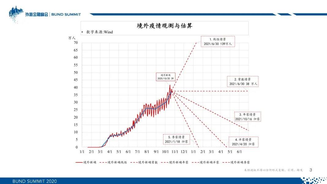 境外疫情現在大家都很關注,根據10月21日Wind更新的數據我做了簡單的預測估算,如果按照目前的線性增長發展趨勢推測,那麼累計到後面可能會發生幾種可能性,大家看圖中紅色虛線部分:第一個是持續線性發展,第二個是如果保持目前的現狀即常數情景,第三個是假設一年之內確診人數能夠歸零,就不再新發生了,第四種和第五種分別是半年和季度歸零的情況。