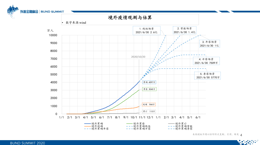 簡而言之,從10月20日開始向後推算的話,如果按照現在的線性增加的情況,到明年6月30日,境外累計確診的就會達到2.6億,如果是保持一個常速的情況,其結果差不多是線性場景的一半(1.4億),一年內歸零的話是1億,如果是半年歸零的話是7500多萬,一季度歸零差不多是近6000萬,這是疫情發展的幾種可能性。現在的累計確診全世界4100萬,大約是世界人口76億的千分之五,如果要按現有確診的概念算的話,就是將近950萬人,是世界人口的大概千分之一的水平,以上就是疫情的大致情況。