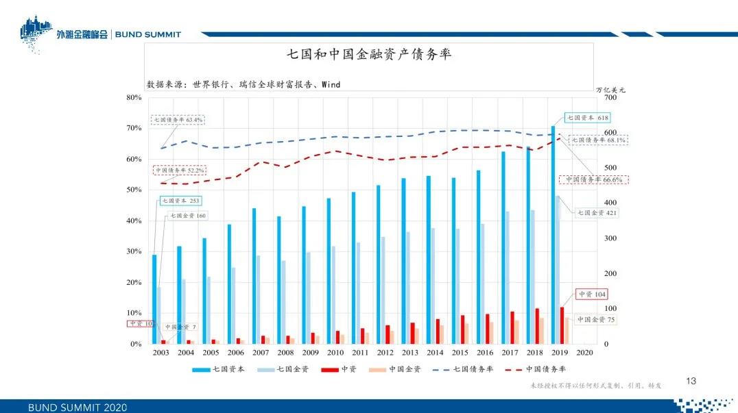 這張圖是這是七國和中國金融資產債務率的比較,負債率在上升,貨幣在迅速增加,利率在降低,降得非常低的水平,有的是0,甚至是負利率,這與貨幣的增長是非常直接相關的,這正好應該也是符合基本金融規律。