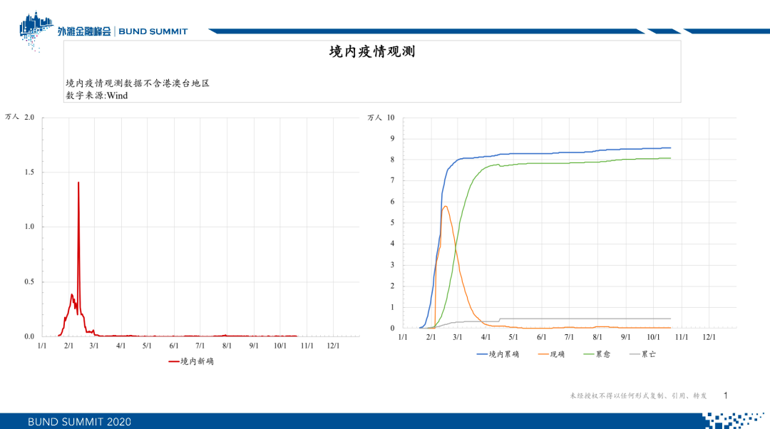 新確大家可以看到有一個前段迅速拉昇,經過一系列迅速的抗疫舉措使得呈現出的數據曲線迅速回落的效果,整個過程一個多月,從1月底到3月初就基本上就控制住了(3月6日新確人數已降至100以下)。右圖中藍線是剛才説的累確,綠線代表的是累計的治癒數,可以看出趨勢是緊隨着累計確診人數的變化,也是前線醫療工作的成效,兩點中間的差值就是灰線代表的累計死亡人數,橙線是現有的確診人數。隨着開始感染的發生到最後逐漸被治癒,新確人數下來,有一小部分人死亡,這是通過衞健委的數據呈現出的一個完整過程,也可以看出我國統籌推進防疫工作和全國攜手抗疫的成果。