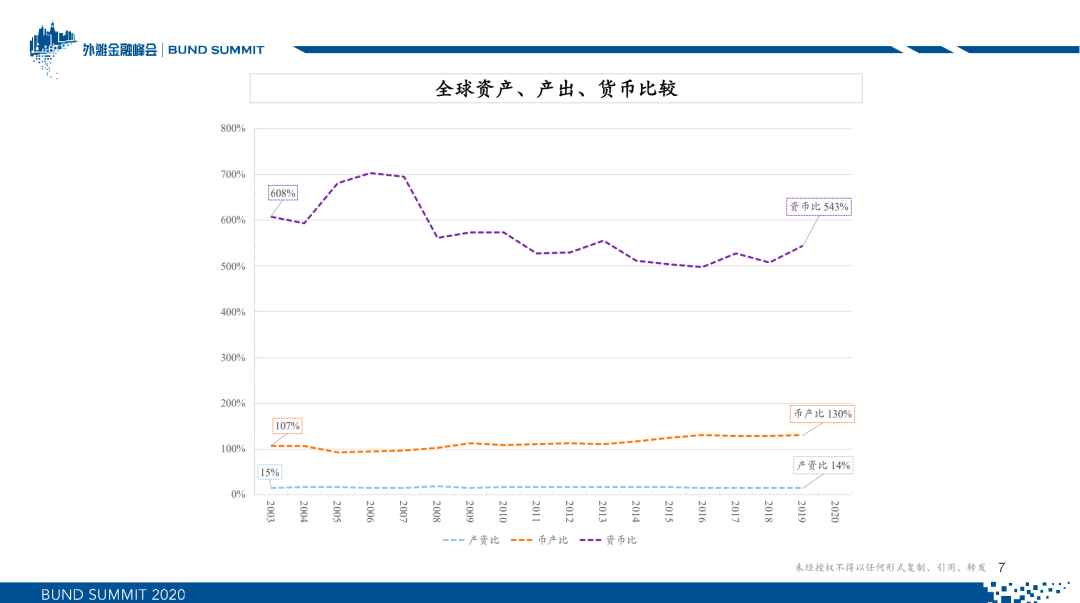 下面這張圖中紫色的虛線是全世界資產與貨幣的比較,從2003開始發展到2007年金融危機前是有一個迅速的提升,後面是一個迅速調整的過程。資產是總的資產,貨幣實際上是代表的銀行形成的金融資產規模,實際上是總的資產跟貨幣比在下降的。中間橘黃色這條虛線是貨幣、產出(生產)相比較,不到二十年有了非常系統性的增長,貨幣的量是越來越大,這其實隱含了一個風險的成分在裏頭。