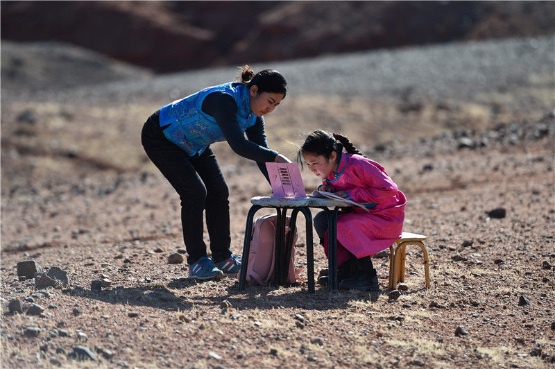 9歲的策耿(右)在家附近的戈壁上網課(4月1日攝)。策耿是內蒙古自治區阿拉善左旗蒙古族學校四年級學生。由於疫情防控,策耿父母長期僱傭的一名外省羊倌沒能回到當地,一家人只好回到阿拉善左旗烏力吉蘇木温都爾毛道嘎查的牧區家中照看羊羣。期間,策耿一邊協助父母,一邊上網課。新華社記者 劉磊 攝