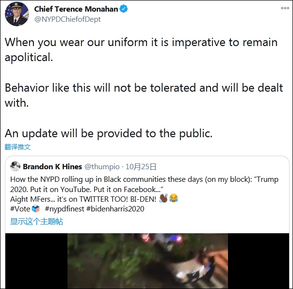 警察局長謝伊(Dermot Shea)譴責這起事件是“百分百不可接受的”。他説,紐約警察必須“為所有紐約人服務,無論其政治信仰如何”。總警監莫納漢(Terence Monahan)也強調:“當你穿上我們的制服時,必須保持政治中立。這種行為不會被容忍,並將被處理”。