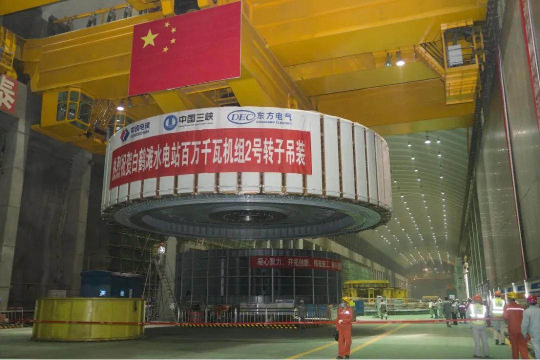 10月26日,吊裝現場,經過40分鐘的水平移動,轉子安全抵達2號機組機坑,隨後平穩落下,至此,白鶴灘水電站工程第三台百萬千瓦水輪發電機組轉子順利吊裝就位。
