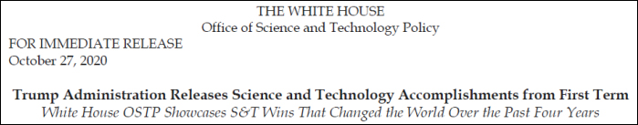 在公佈這份列表的新聞稿中,白宮科技政策辦公室誇獎特朗普政府採取“果斷行動,動員學術界、各行業和政府的科學家及衞生專業人員去了解、治療和戰勝這種疾病。”