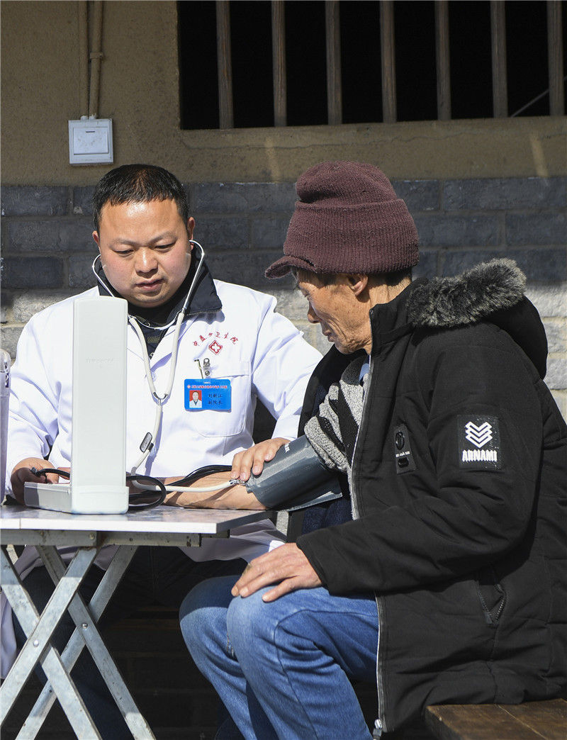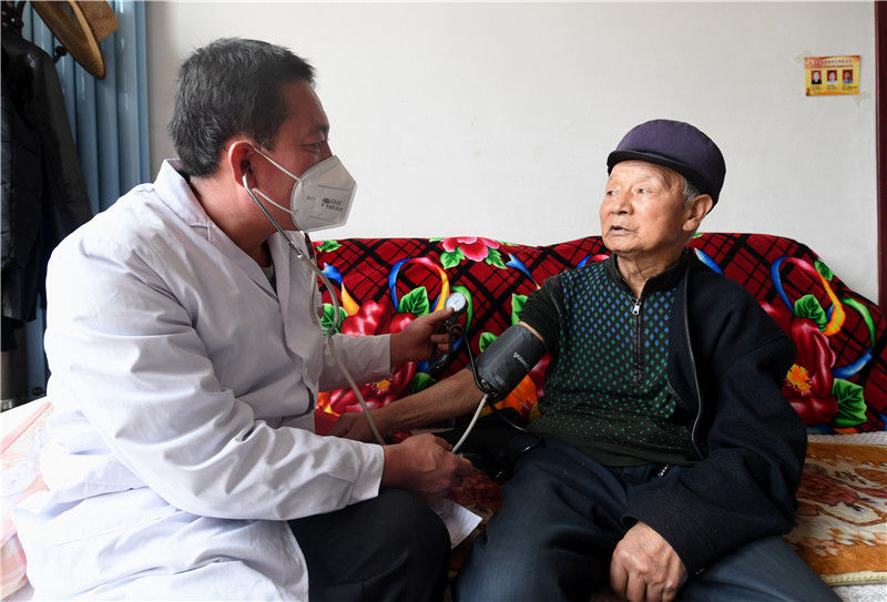 河北阜平縣龍泉關鎮顧家台村村醫為村民測量血壓(4月15日攝)。新華社記者 王曉 攝