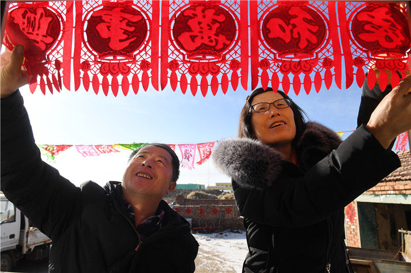 在河北省張北縣小二台鎮德勝村,村民徐海成(左)和妻子在家中佈置春節裝飾(2018年2月9日攝)。新華社記者 牟宇 攝