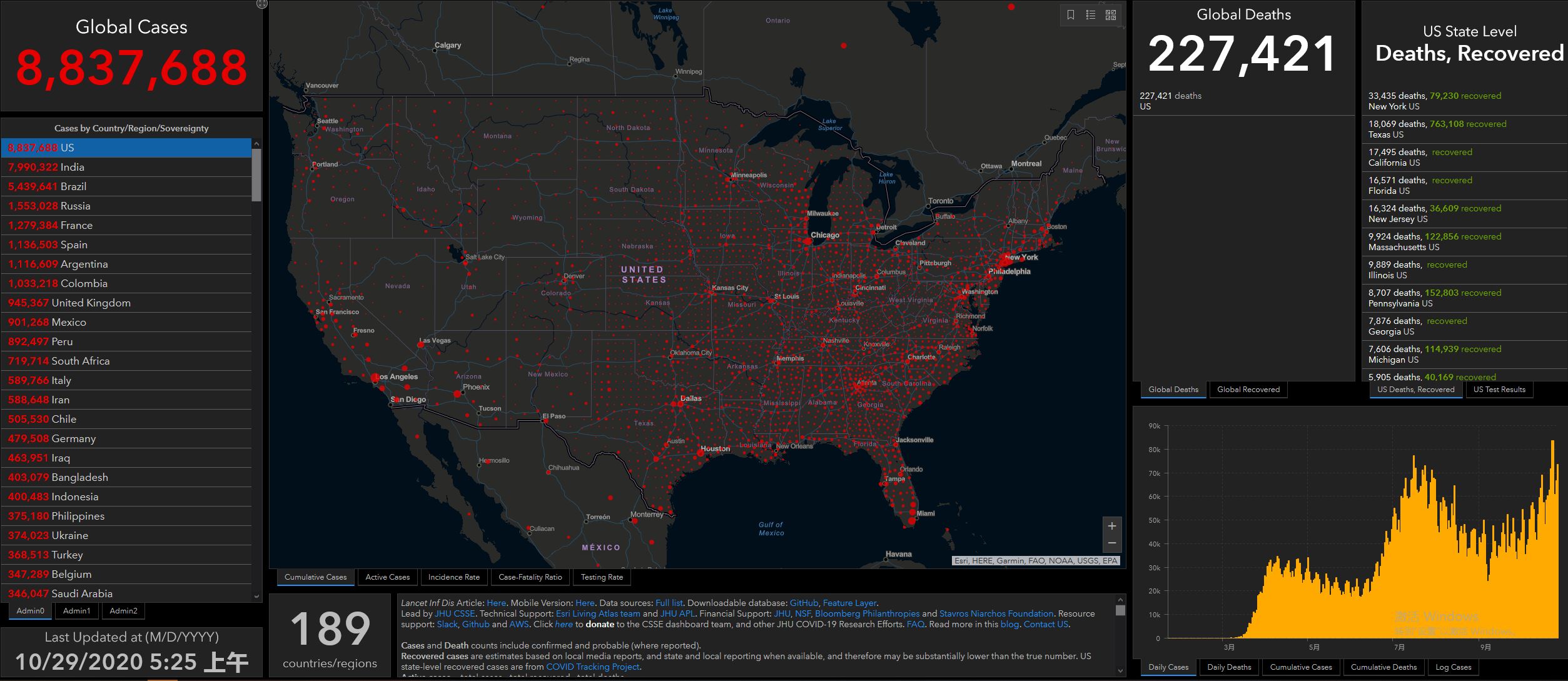 (觀察者網訊)根據美國約翰斯·霍普金斯大學實時數據,截至北京時間10月29日5時25分,美國累計新冠確診病例8837688例,累計死亡227421例。過去24小時,美國新增確診病例70704例,新增死亡病例897例。