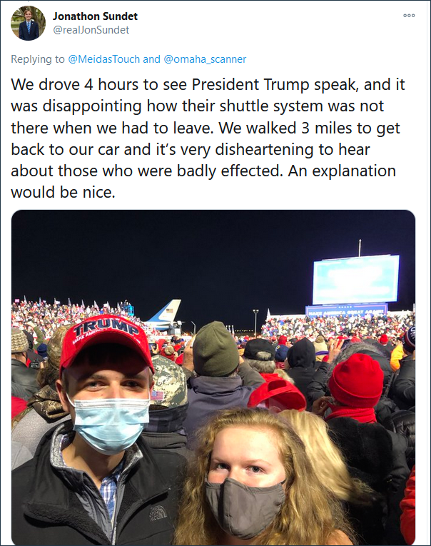 驅車四小時前往參與集會的喬納森·桑德特作為選擇步行的人之一,**花了大約一個小時才走回停車場。**桑德特隨後發推稱這種情況“令人沮喪”,他要求特朗普競選團隊作出解釋。