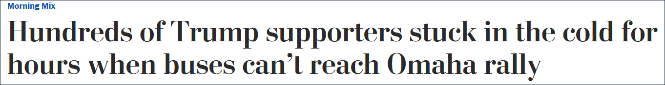週三,特朗普的競選團隊發言人薩曼塔·扎格在一份聲明中將責任歸咎於道路封閉。她説,特朗普熱愛他的支持者,對支持者參加奧馬哈的集會感到非常激動。“儘管天氣寒冷,但是成千上萬的人蔘加了他的集會”,“由於人數過多,我們安排了40輛班車,而不是一般情況下的15輛,但當地道路的封閉,導致了交通擁堵。”