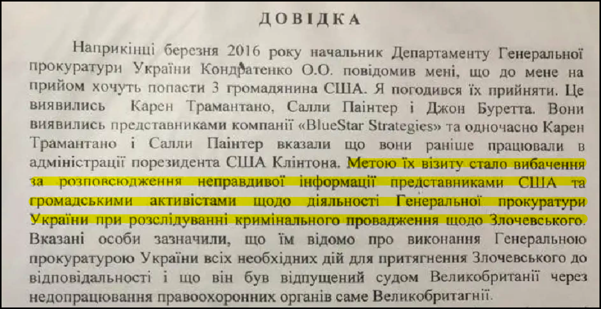 紹金辭職後的代理總檢察長:“他們來訪問的目的是對美國代表和公眾人物就檢察長辦公室關於茲洛切夫斯基(布里斯馬創始人和所有者)犯罪活動調查的活動散佈虛假信息表示道歉”[19]