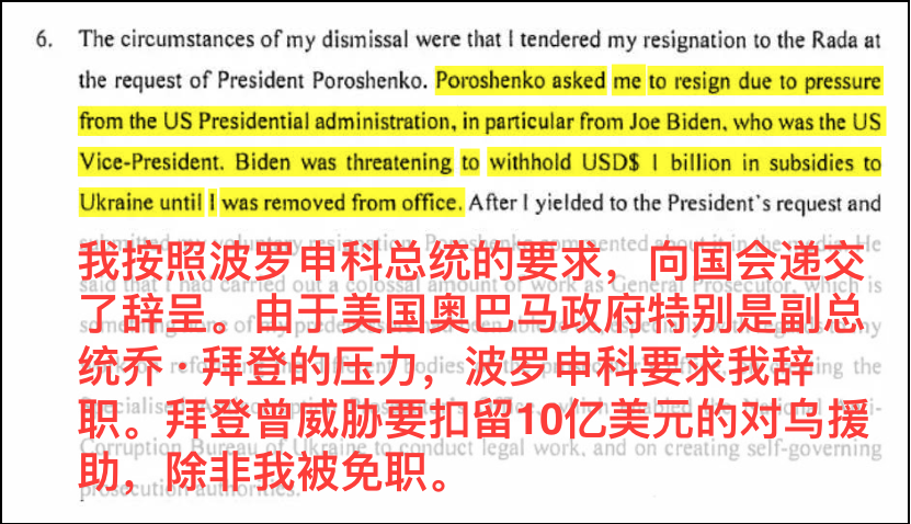 兩年前,拜登曾在美國外交關係委員會舉辦的一場公開活動中自豪地炫耀,自己曾以10億美元援助資金為籌碼,讓烏克蘭政府解僱了總檢察長維克多·紹金:“我跟他(指烏克蘭時任總統波羅申科)説,‘你們拿不到10億美元(援助)了……我6個小時後將會離開這,如果總檢察長沒被炒魷魚,你們就拿不到錢了。’”而事情的結果,按照拜登所言,“然後那個XX養的傢伙,他就被開除了。然後他們換上了一個更可靠的人(當檢察長)。”[8]。