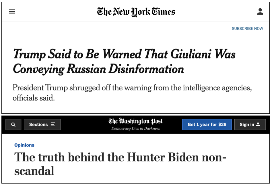 在最近的幾天時間裏,《紐約時報》等自由派媒體不遺餘力地將亨特郵件泄露事件描述成“俄羅斯的假情報戰”[22][23]。《華盛頓郵報》的記者格雷格·薩金特則直接斷言《紐約郵報》“報道的大部分內容純屬杜撰/未經證實/高度可疑”[24]。社交網站推特和臉書更是違背美國的政治傳統,拋棄互聯網平台本應持有的客觀標準,直接對《紐約郵報》的報道進行了屏蔽和限制分享,公然為民主黨競選保駕護航。