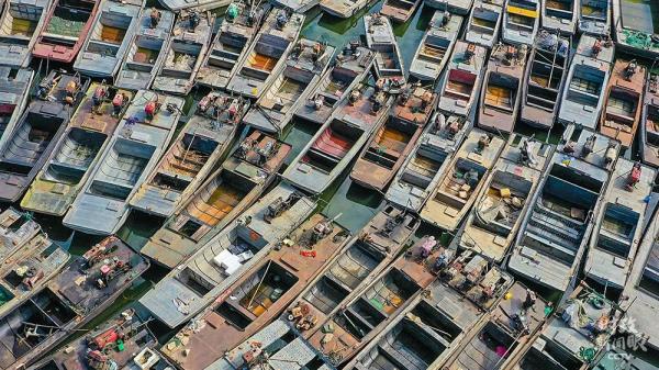 △國家實施長江流域禁捕退捕政策後,江蘇宿遷泗洪縣啓動洪澤湖水域禁捕退捕和住家船整治工作。這是聚集在漁港等待拆解的漁船。