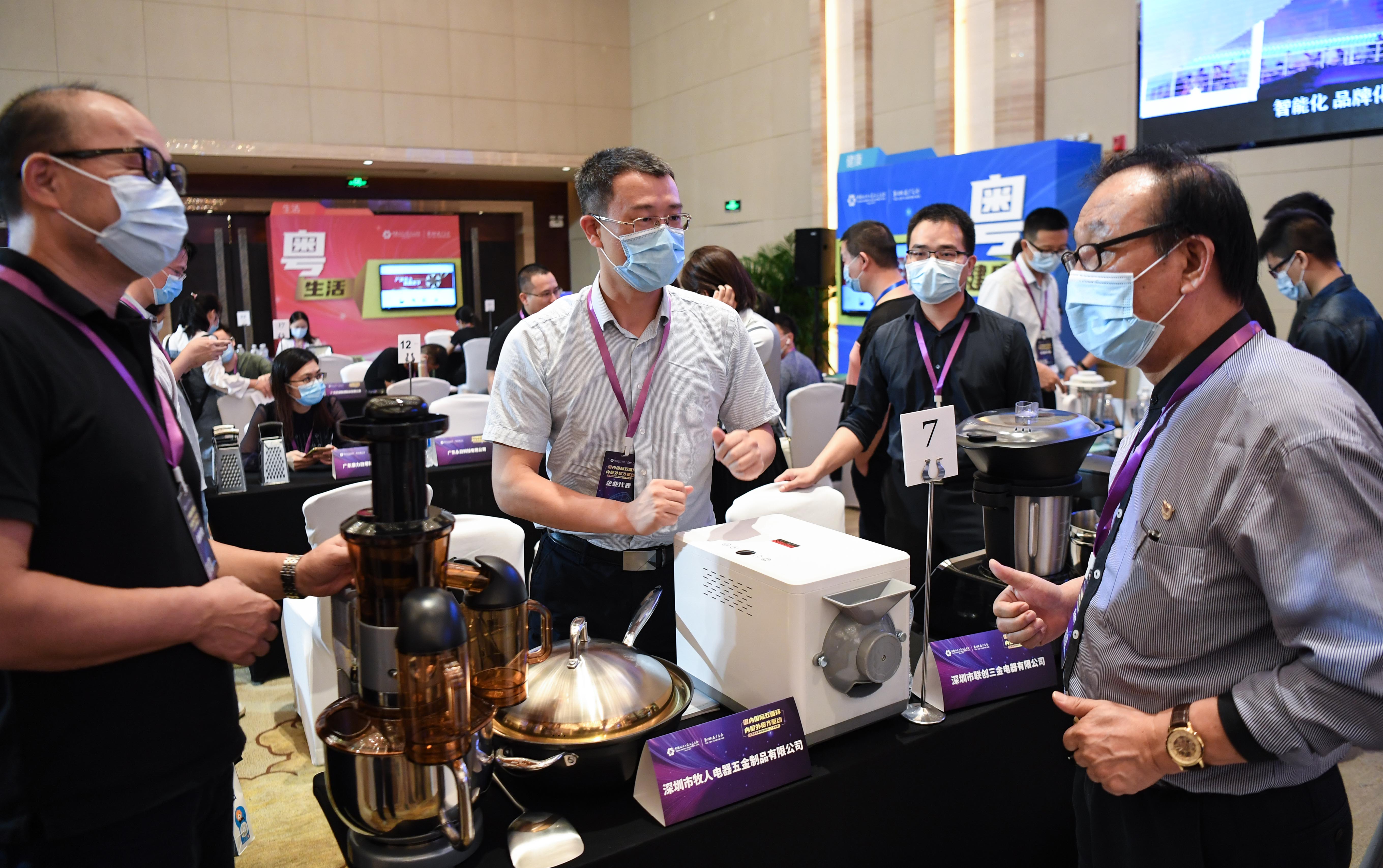 10月16日,在第128屆網上廣交會的線下雙循環貿易促進活動上,企業代表和採購代表洽談業務。(新華社圖)