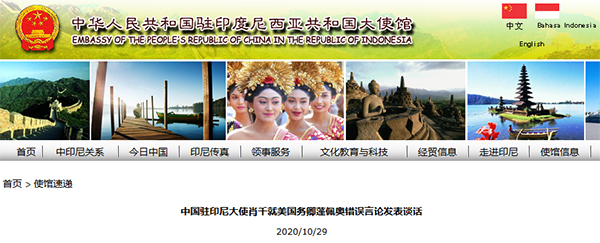 對於蓬佩奧訪問印尼期間發表的錯誤言論,中國駐印尼大使肖千10月29日表示,蓬佩奧無端攻擊抹黑中國,挑撥中印尼關係,破壞地區和平穩定,中方對此堅決反對。蓬佩奧近來一系列錯誤言行進一步暴露了美方的險惡用心,彰顯了美自身存在的嚴重問題。美國是“新冷戰”的煽動者、是“政治病毒”的超級散播者、是世界開放合作的阻礙、是全球最大的黑客帝國、是伊斯蘭世界的痛苦製造者、是損害南海和平的最危險因素、是地區合作的破壞者。