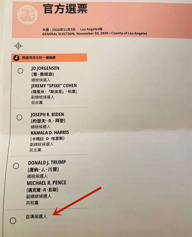 我朋友給我發了一張照片,是洛杉磯的中文選票。其中拜登和特朗普你們都知道。我想給你們看的是下面:自填候選人。