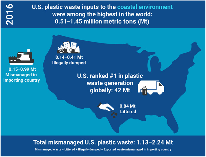根據2016年的數據,美國收集的可用於回收的塑料垃圾,有超過一半被運往國外,其中出口的約90%的國家存在有效管理塑料垃圾方面的困難。