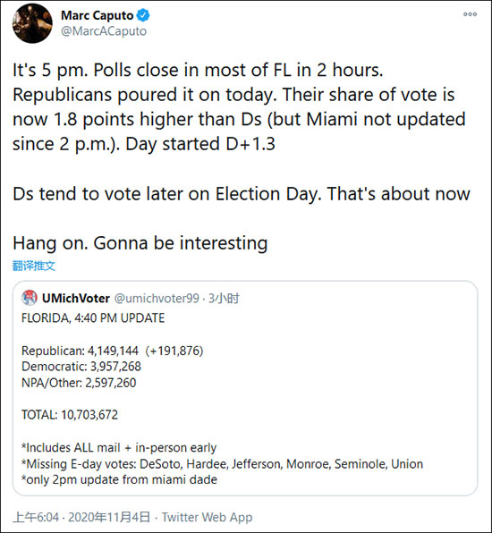 早前,當地時間3日下午5時,“政客”新聞網記者馬爾科·卡普託發推形容共和黨的選票“如潮水般湧來”,稱截至當天下午5時,佛羅里達州共和黨選民的投票率要高出民主黨1.8個百分點。卡普託轉載的投票結果似乎也印證了他的説法。在他發推的時間點,特朗普在佛羅里達州獲得了4149144張選票,領先拜登191876張。