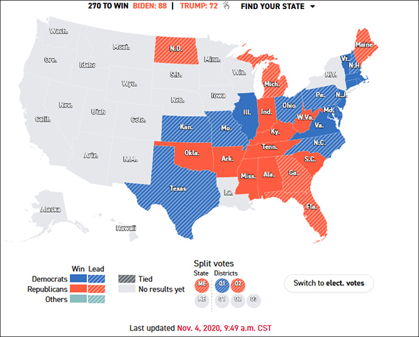 《紐約時報》和美聯社計票結果為,拜登85:72領先特朗普。福克斯新聞則顯示拜登91:67領先。計票稍慢的CNN和CBS新聞網則顯示,特朗普在稍早前領先拜登。
