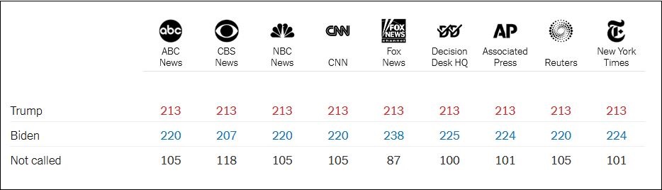 《紐約時報》和美聯社計票結果為,拜登224:213領先特朗普。福克斯新聞則顯示拜登238:213領先。《紐約時報》本次還納入了選舉預測機構Decision Desk HQ,這也是首個預測佛羅里達州成為本次大選“戰場州”的機構。根據這一機構預計,特朗普以213:225落後拜登。