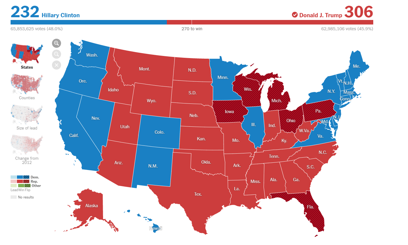 值得一提,目前各州的唱票工作還在進行之中,而在選舉人團機制下,當一個候選人普選票數明顯佔優勢的情況下,美國媒體即預測該候選人可贏得該州所有的選舉人票。