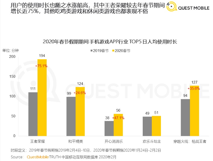 一個更多人知道的事實是,疫情對手遊市場的影響。據QuestMobile2月發佈的《2020中國移動互聯網“戰疫”專題報告》,春節期間,王者榮耀用户時長暴漲75%,從此前每人每天不到2小時,到平均超過3小時(194分鐘)。而在氪金上,王者也一騎絕塵,創下了日流水峯值20億元的記錄,連帶着騰訊的股價也竄上高位。