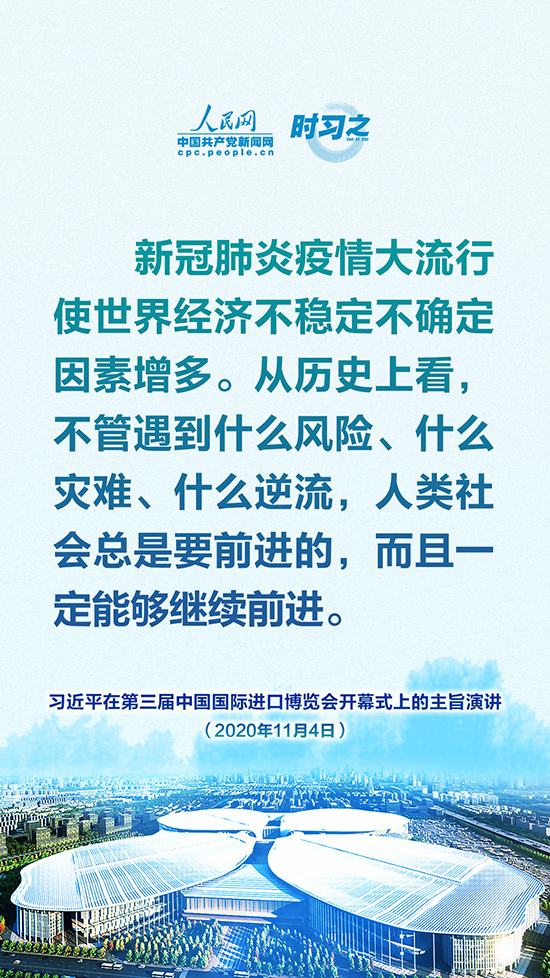 全面擴大開放!習近平在進博會上的主旨演講擲地有聲 2020-11-04 第三屆中國國際進口博覽會開幕式於11月4日晚在上海舉行,國家主席習近平以視頻方式發表主旨演講。人民網·中國共產黨新聞網“時習之”欄目製作了10張海報,帶您一起回顧習近平這些擲地有聲的話語。