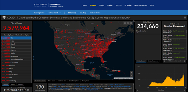 (觀察者網訊)根據美國約翰斯·霍普金斯大學實時數據,截至北京時間11月6日6時25分,美國累計新冠確診病例9579964例,累計死亡234660例。過去25小時,美國新增確診病例125260例,新增死亡病例1304例。