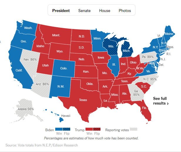 截至美東時間11月5日1時30分,美國大選開票情況(圖/紐約時報)