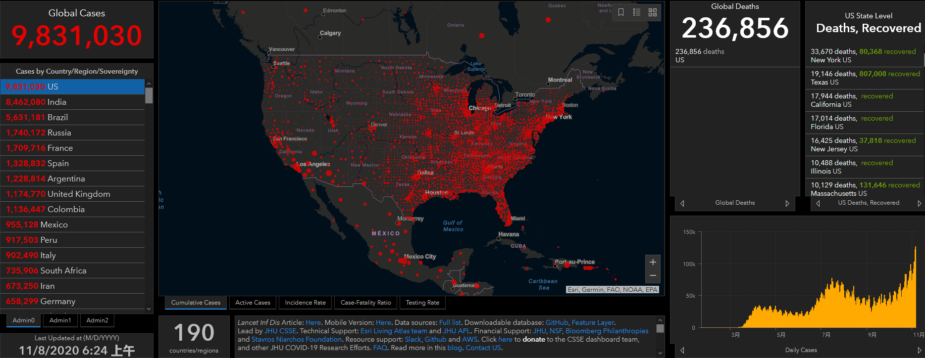 (觀察者網訊)根據美國約翰斯·霍普金斯大學實時數據,截至北京時間11月8日6時24分,美國累計新冠確診病例9831030例,累計死亡236856例。過去24小時,美國新增確診病例123934例,新增死亡病例1095例。
