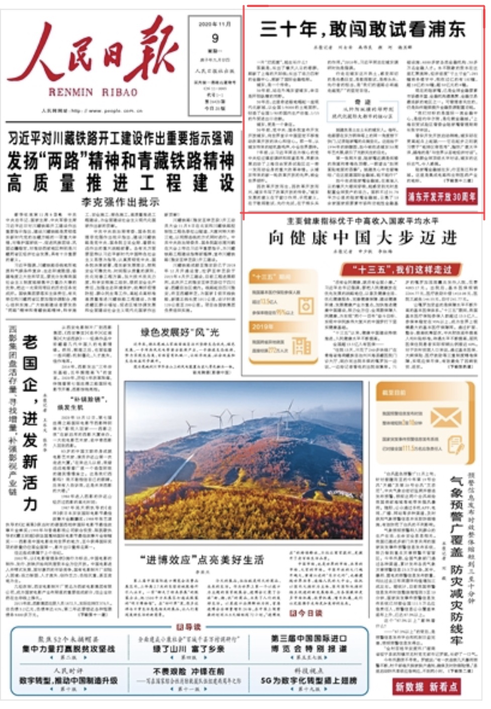 人民日報11月9日頭版刊登《三十年,敢闖敢試看浦東(浦東開發開放30週年)》。