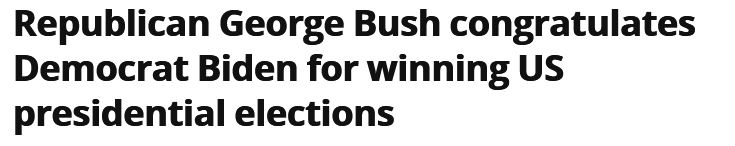 小布什還稱,他也同時向贏得7000萬張選票的現任總統特朗普表示祝賀,並稱之為一項“非凡的政治成就”。