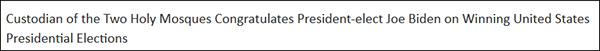 沙特王室:祝賀拜登和哈里斯勝選,希望繼續加深與美國的合作