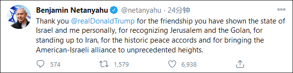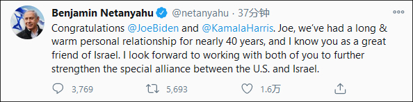 與沙特關係緊張、但同樣是特朗普親密夥伴的以色列總理內塔尼亞胡,稍早時候也打破了近12個小時的沉默。內塔尼亞胡在推特上給拜登送去了祝賀。