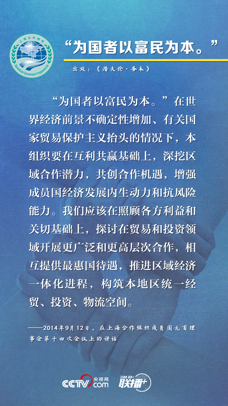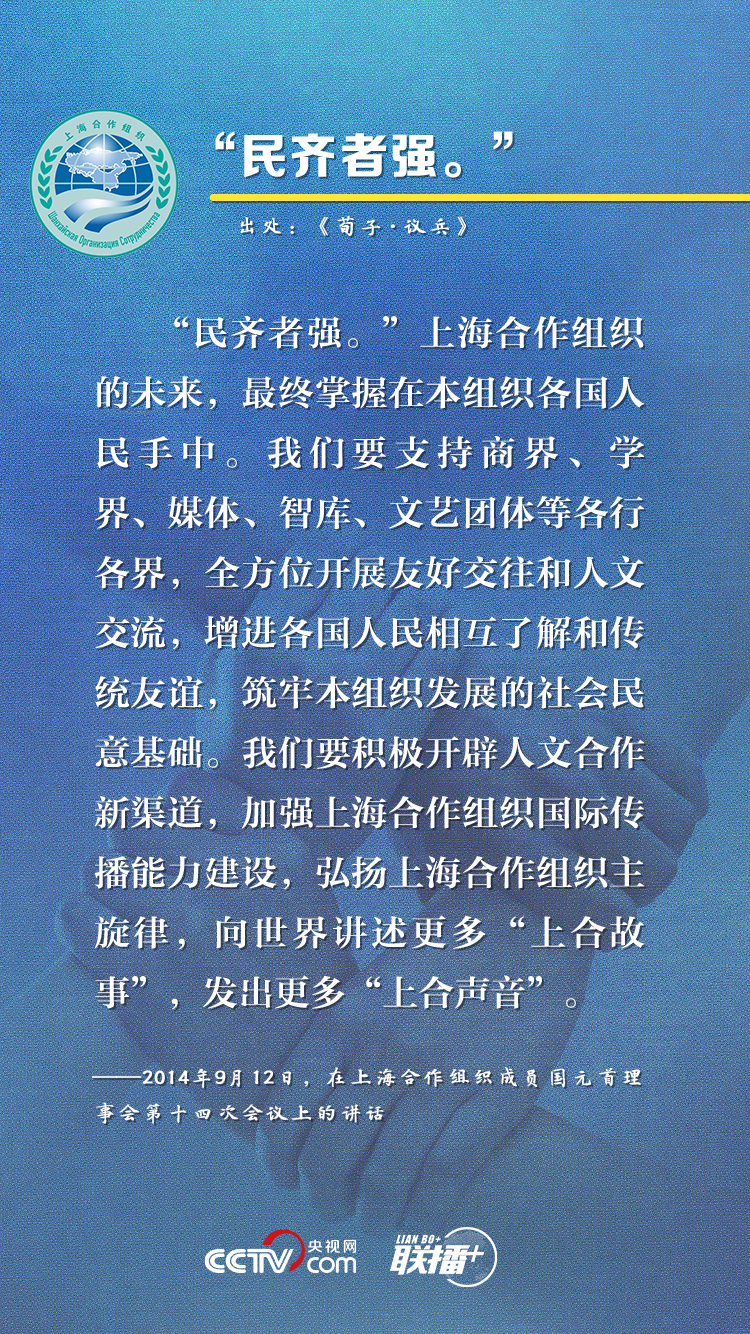 上海合作組織成立19年來,始終保持健康穩定發展勢頭,成功探索出一條新型區域組織的合作與發展道路。近年來,習近平主席在參加上合組織峯會時多次引用典故,就上合組織發展提出建議,這也成為他對上合之“合”的生動闡釋。央視網《聯播+》欄目特對相關內容進行梳理,與您一起感受“上海精神”的強勁動力。