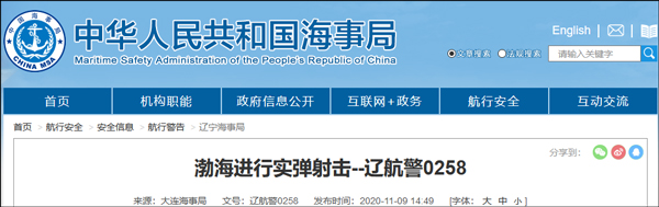 中國海事局網站消息,11月9日,大連海事局發佈航行警告: