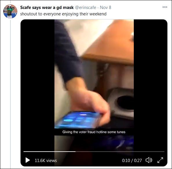 赫什11月7日在推特上分享了電話錄音,還説“(這熱線)我……應該能打一晚上。”果然,他沒過一會又發了一段錄音。這次,他用《怪誕小鎮》裏一個角色的聲音説,“我想供認一次投票作弊,我很自豪,想分享給朱利安尼(注:特朗普律師、前紐約市長)先生聽。”
