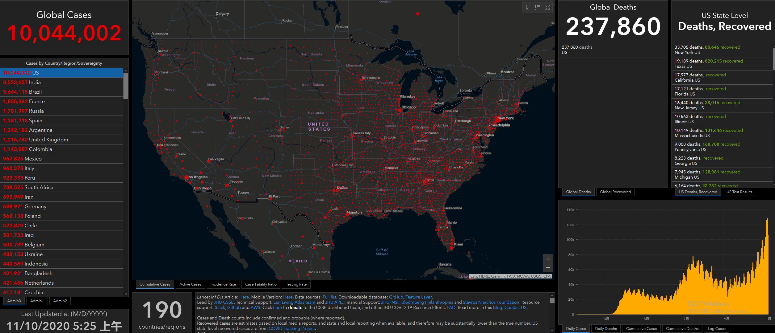 (觀察者網訊)根據美國約翰斯·霍普金斯大學實時數據,截至北京時間11月10日5時25分,全球累計新冠肺炎確診病例50768019例。