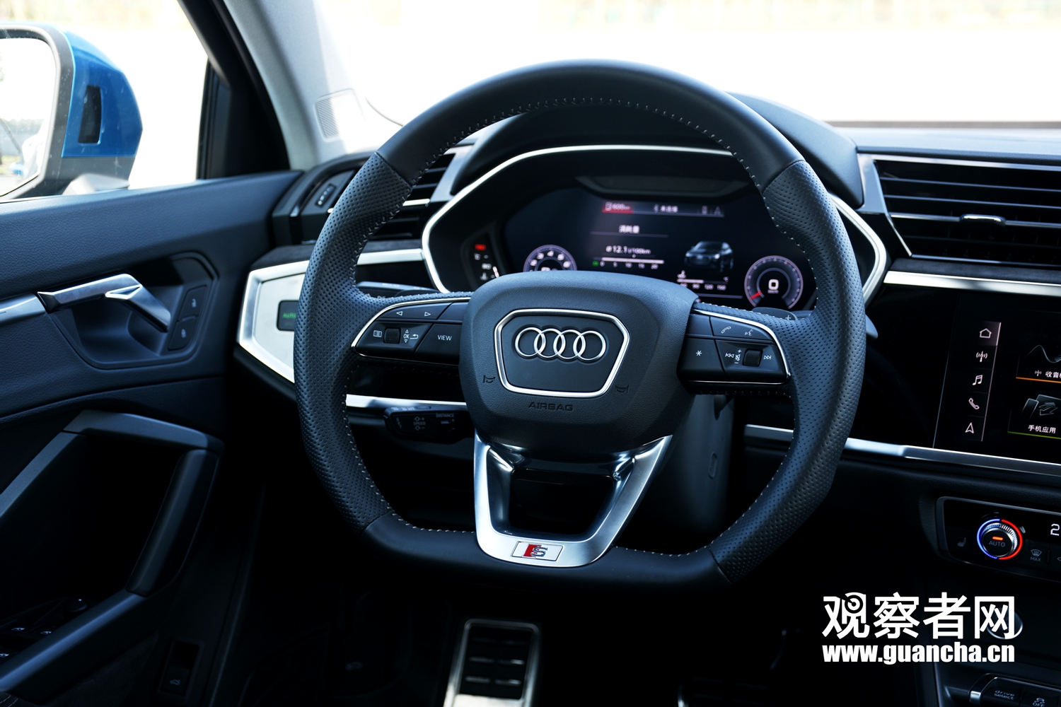 作為一款主打運動感的車型,奧迪Q3轎跑的方向盤並沒有給筆者留下很好的印象。儘管在自定義設置中可以調整方向盤力度,但實際體驗來看,即使是阻力最強的運動模式,方向盤也是一種偏鬆垮的感覺。不過得益於quattro全時四驅系統,奧迪Q3轎跑在轉向上很容易滿足駕駛員的操控需求。