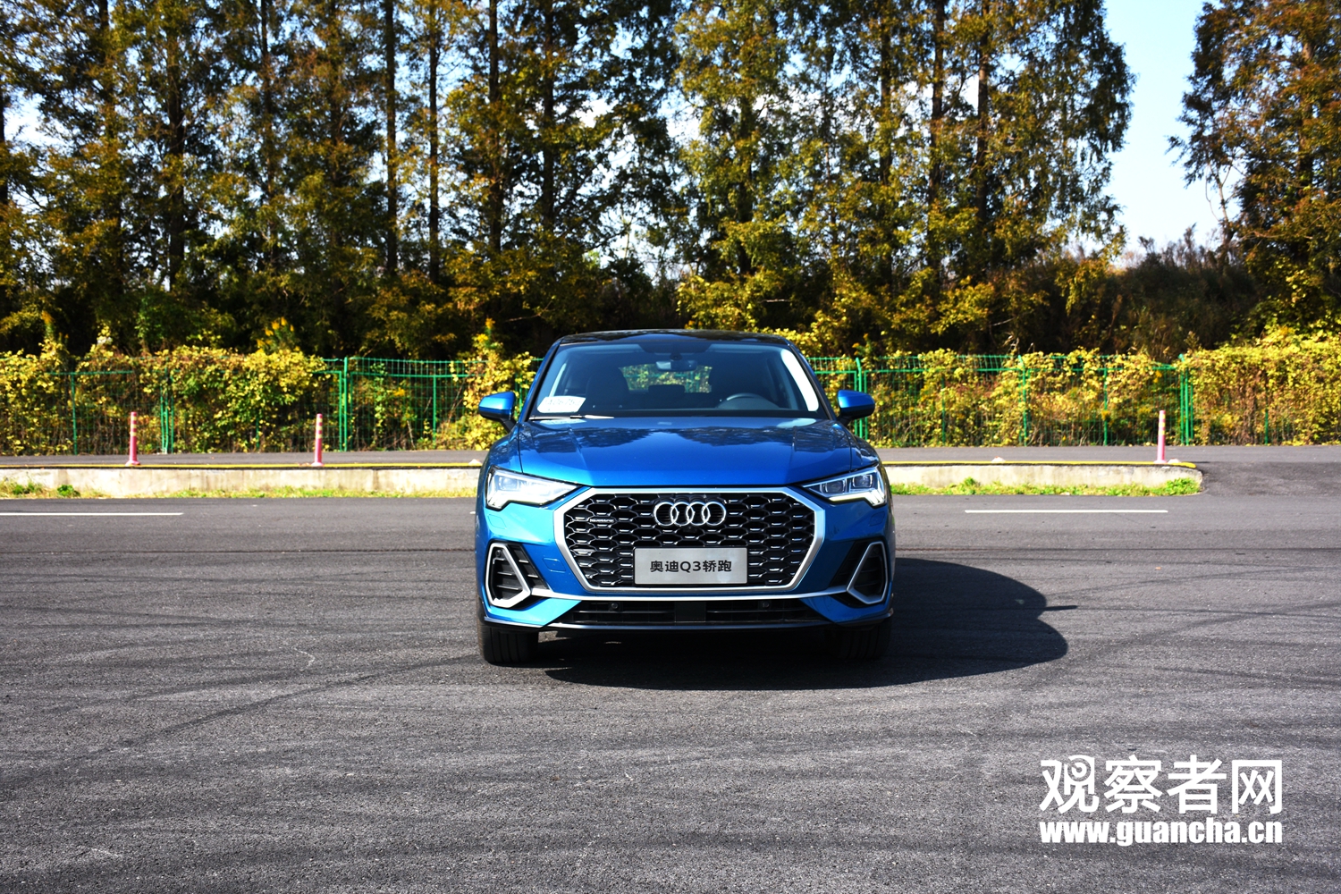 由於Q3轎跑是Q3的衍生車型,因此兩者在外觀上大體相當。雖然前臉都是家族化設計的八邊形蜂窩狀中網,但為突出跨界車型的特點,奧迪Q3轎跑的進氣格柵面積相較普通版有所增大,在突出前臉的視覺張力的同時,更加寬闊的邊框設計也凸顯了一定金屬的質感。在中網左側則點綴以quattro的Logo與普通版車型加以區分。