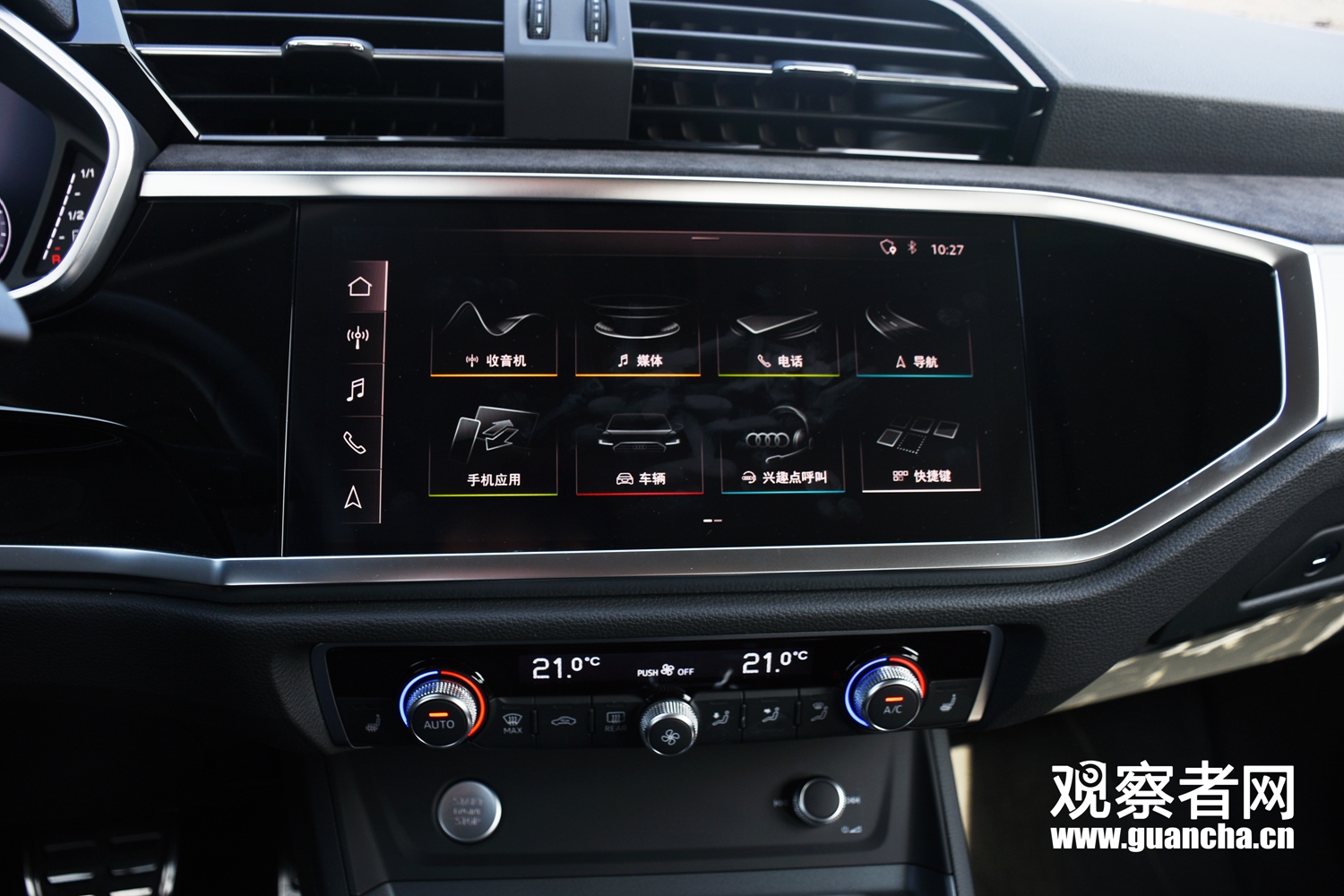作為一款面向年輕用户的跨界車型,自然少不了能夠體現產品科技屬性的智能網聯功能。奧迪Q3轎跑的中控台標配8.8英寸中控顯示屏,高配版本可選10.1英寸屏。搭載的MMI系統採用獨立中央處理器設計。使液晶儀表盤可與之形成高度互聯。