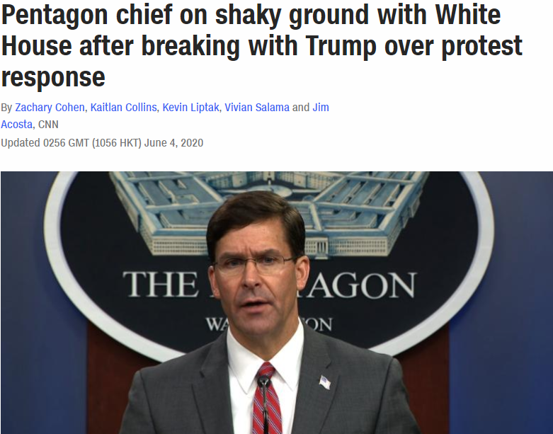 埃斯珀曾代表五角大樓公開反對特朗普希望使用軍隊鎮壓抗議活動