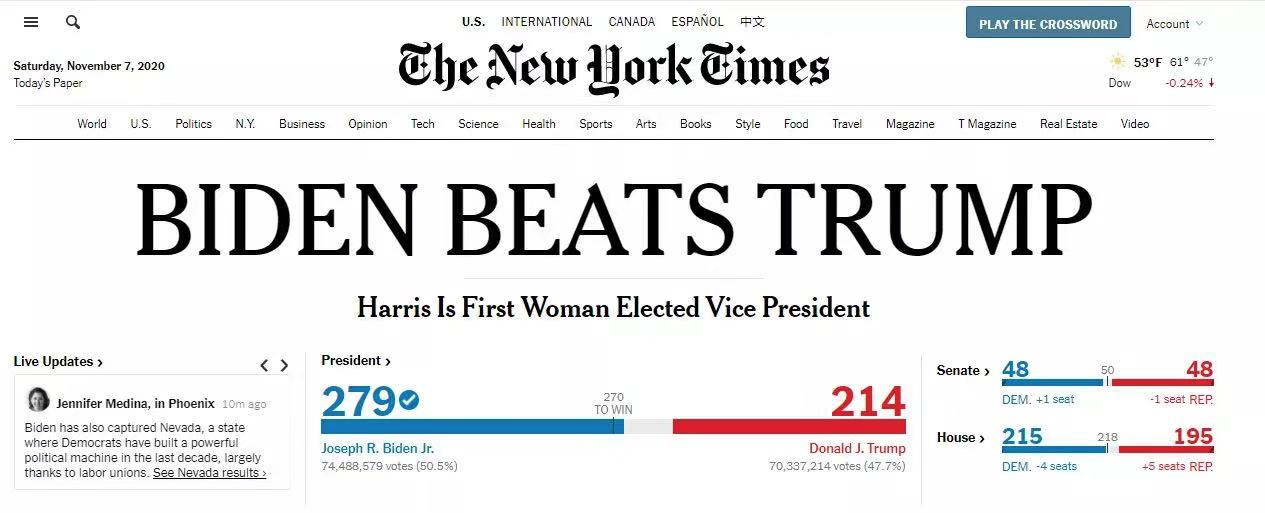 CNN、紐約時報宣佈拜登獲勝,由媒體宣佈下任美國總統是誰,也是活久見