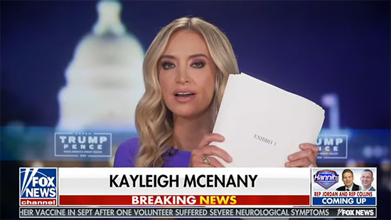 共和黨全國委員會主席麥克丹尼爾及白宮新聞秘書麥克納尼也被漢尼蒂請來了。他和這兩人探討了一番“郵寄選票危害特朗普大選”,麥克納尼更是展示了一份234頁的“證據”,稱特朗普團隊將繼續訴諸法律,確保“清點的每一張選票均為合法”。