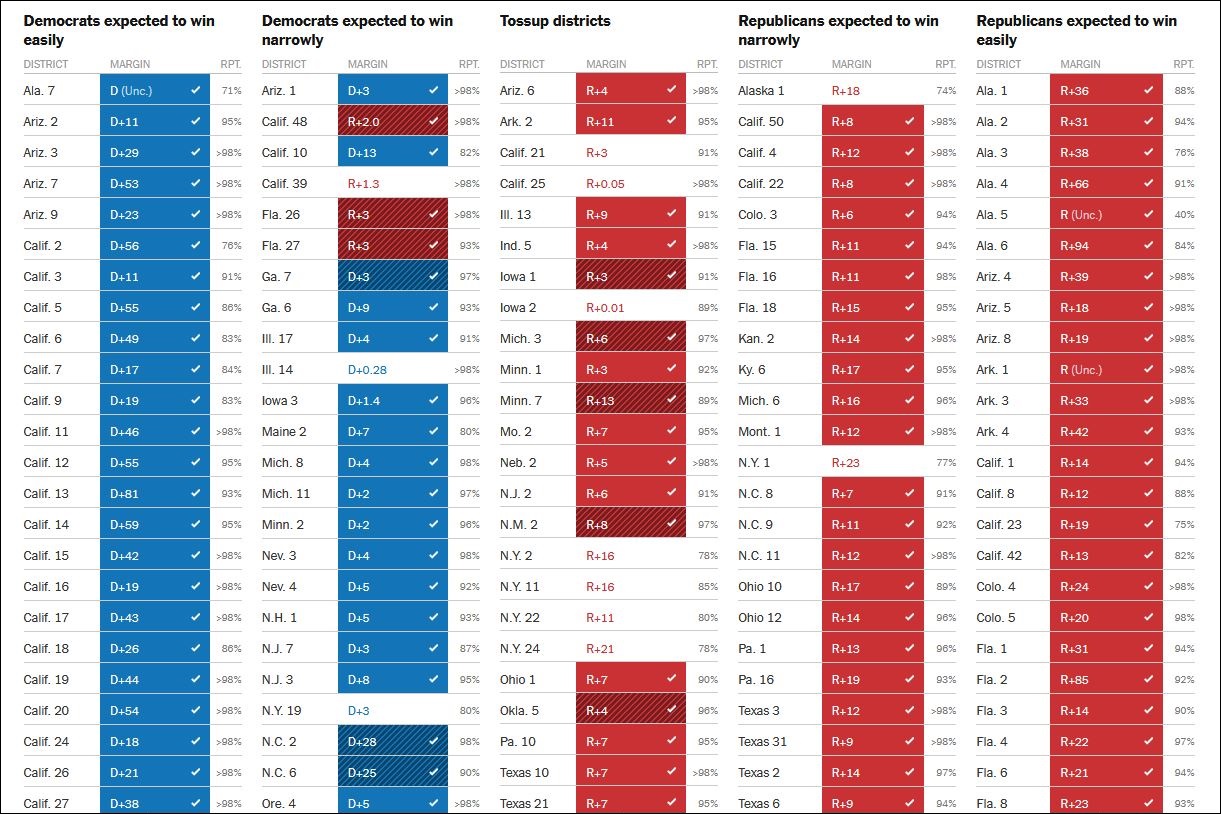 值得注意的是,《紐約時報》本次預測民主黨能“輕鬆贏取的選區”中,共和黨在暫時72%開票率的情況下,於紐約州第三選區取得1.5%的領先優勢。而在民主黨能“以微弱優勢贏取”的36個選區中,共和黨確定拿下2席,並預計能在4個選區贏得勝利。