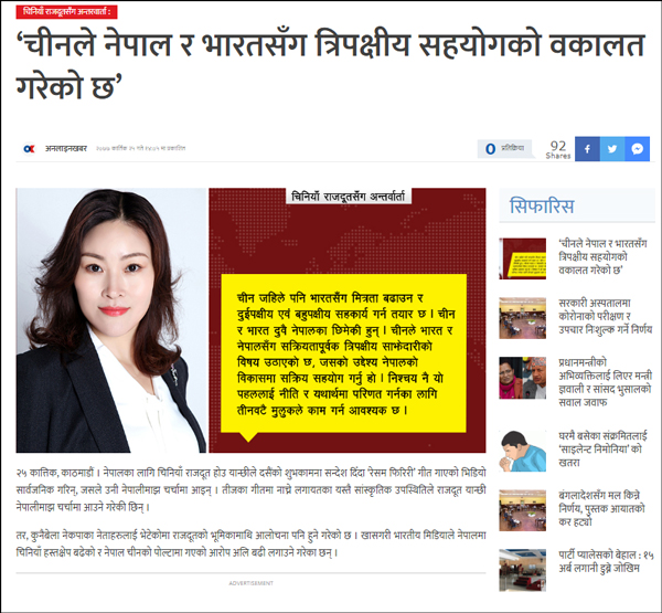 中國駐尼泊爾大使館網站11月11日消息,日前,中國駐尼泊爾大使侯豔琪在使館接受尼新聞在線網專訪,就中尼“一帶一路”及互聯互通合作、中國抗疫經驗及國際合作、所謂“中國侵佔尼領土”等回答記者提問。