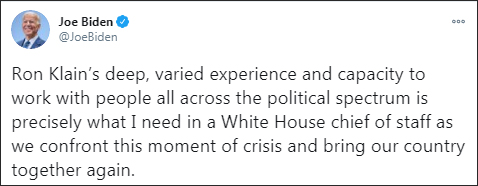拜登發推,白宮幕僚長由(當選)總統直接任命,不需要參議院通過