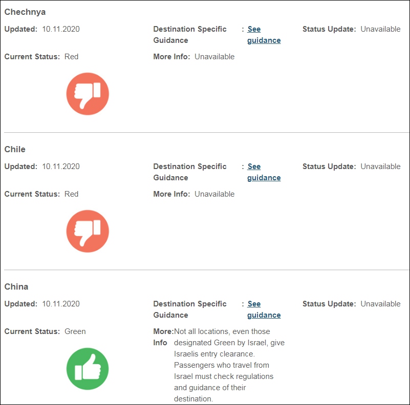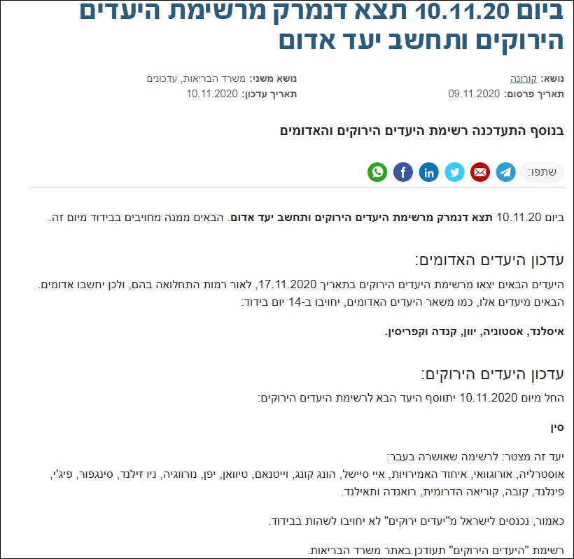 在中國被列入綠色目的地名單的同時,考慮到發病率的變化,以色列決定把加拿大、愛沙尼亞、塞浦路斯、冰島、希臘從11月17日起列入紅色目的地名單。