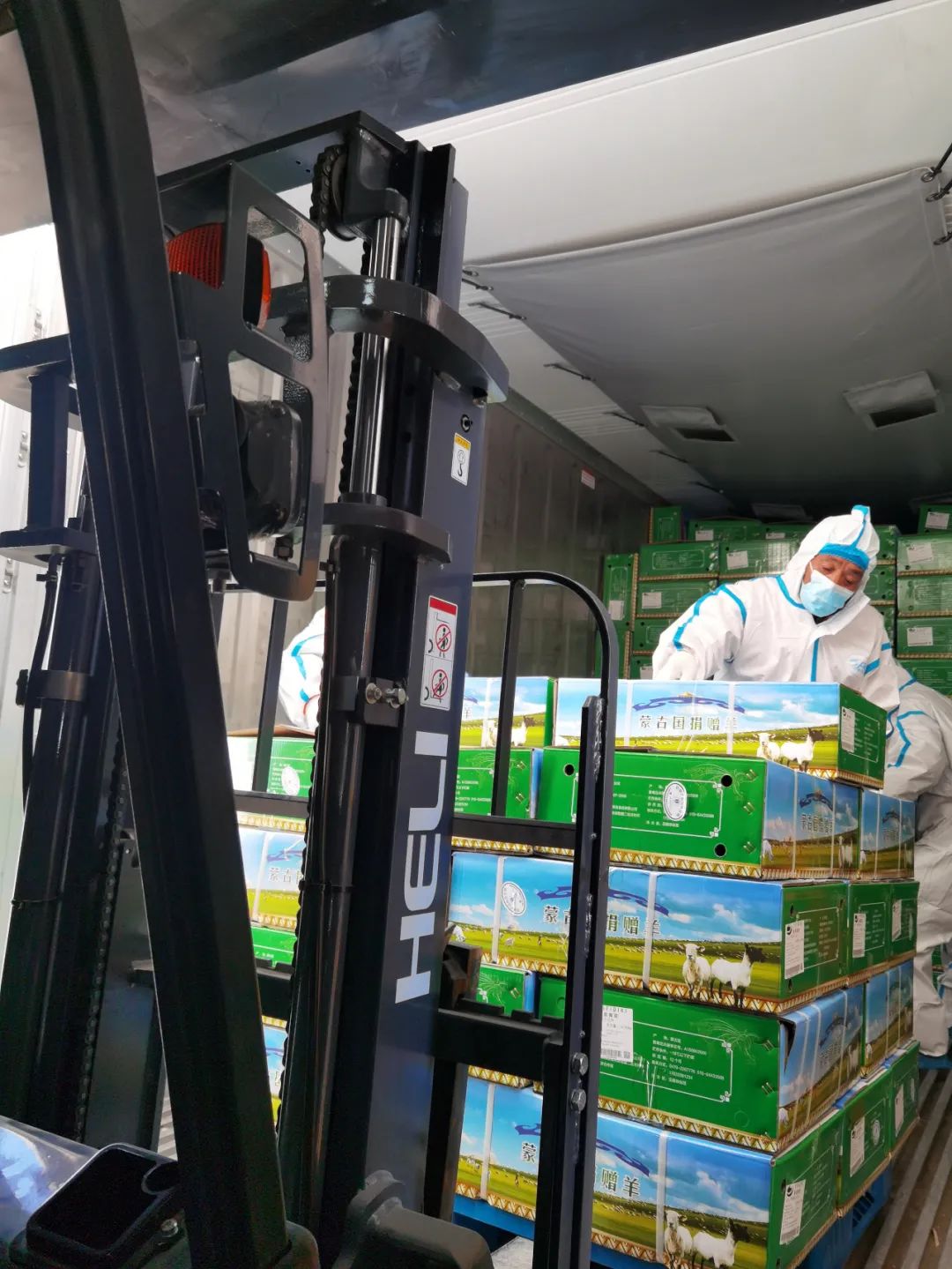 11月12日,蒙古國捐贈湖北的首批12000只經屠宰加工的羊全部被裝運到集裝箱冷鏈車上。